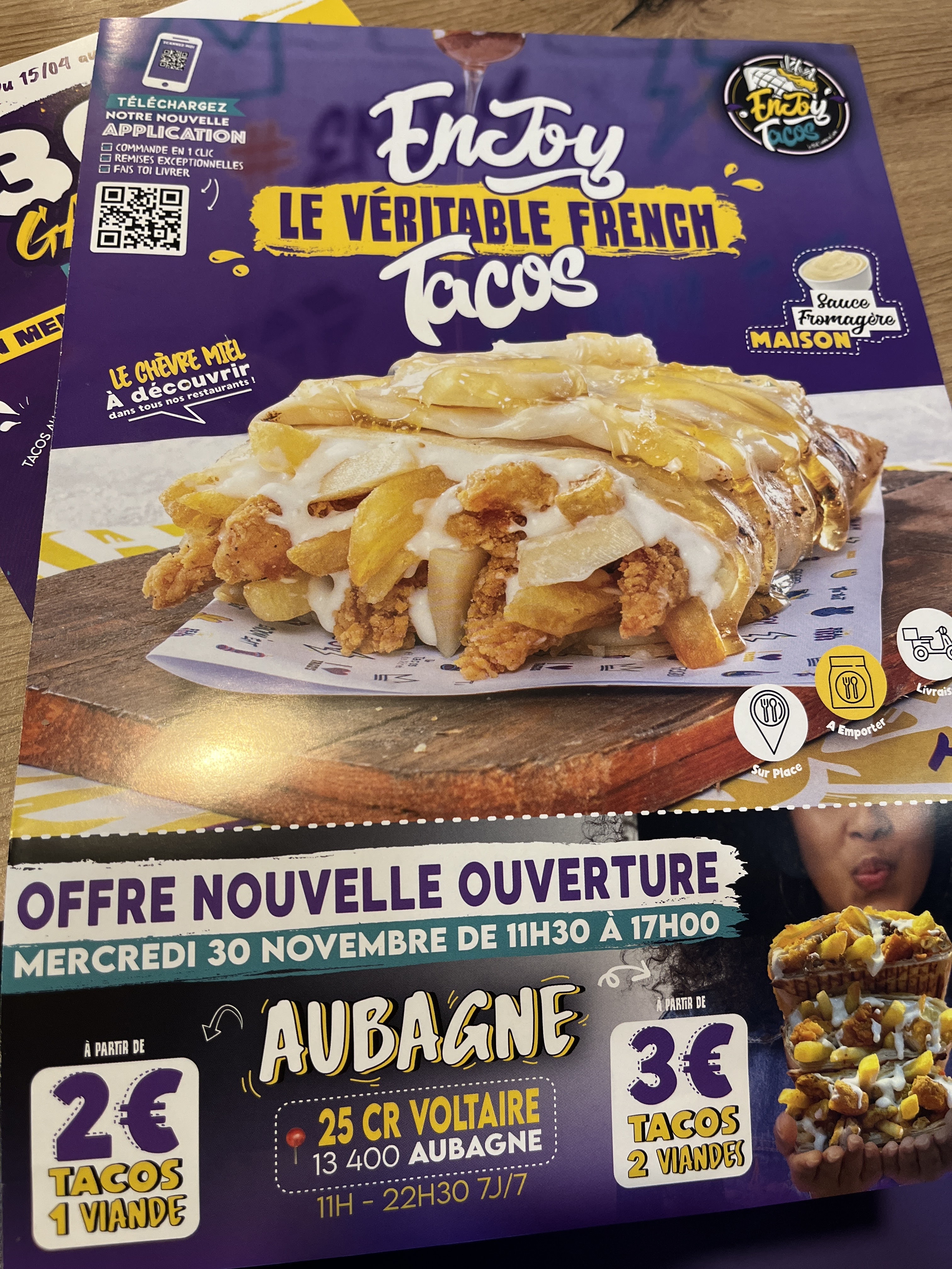 Posté le 27/11/2022 à 12:57"ENJOY TACOS (NOUVEAU 2022) Tarifs bien trop élevés, non alignés avec les autres tacos d'Aubagne. 8.90e pour un 2 viande(de la taille d'une main) sans boisson. Si vous voulez viande kebab, supplément +50centime Tenders: +1euro. Sachant ce que j'ai payé pour un 2 viandes, les supléments sont bien trop chers! Sans compter les supléments de crudités et sauces, du jamais vu sur Aubagne et alentours. Il va falloir s'aligner car même si les tacos sont bons on ne reviendra pas."