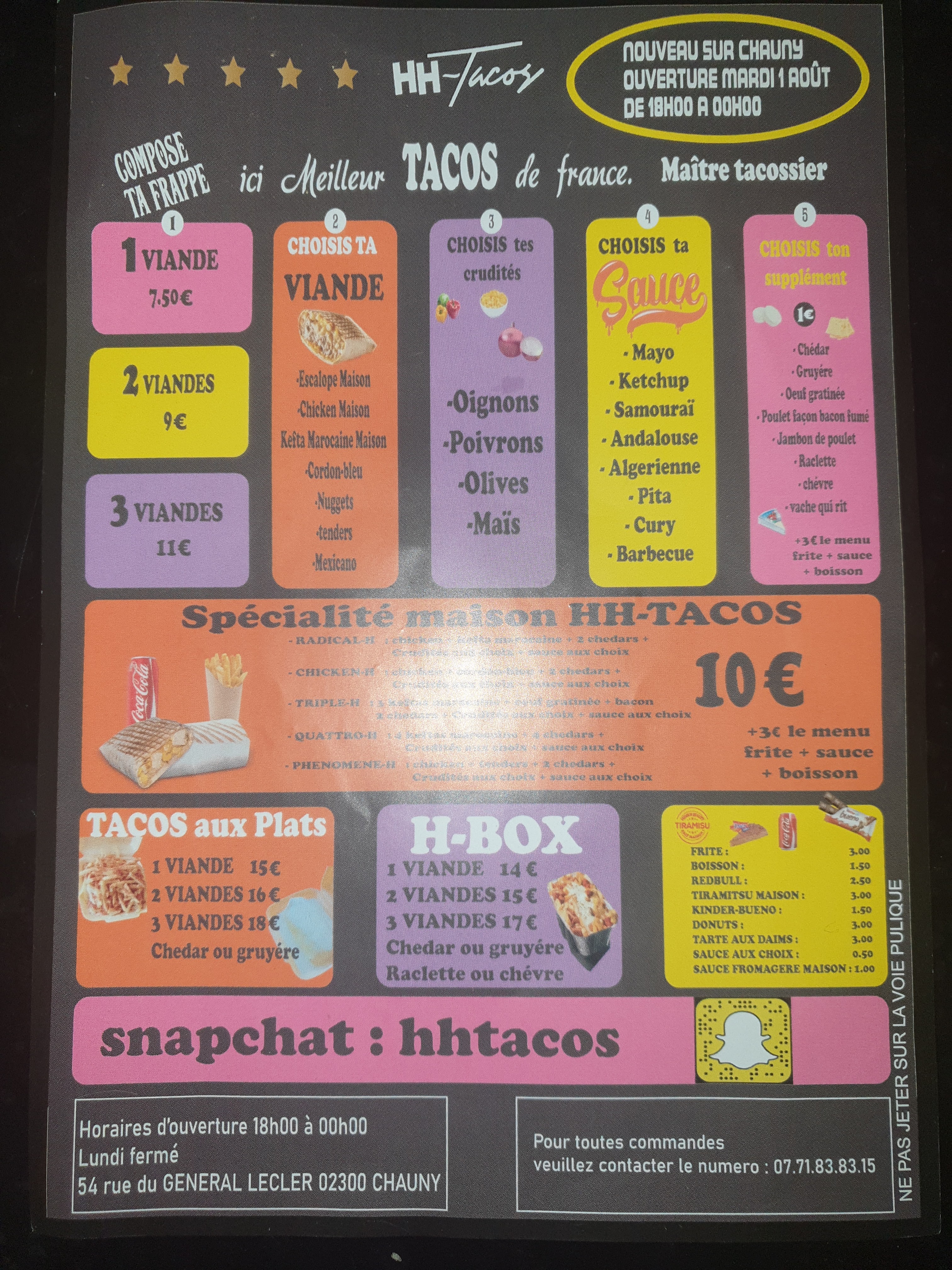 Découvrez toutes les informations concernant Restaurant de tacos HH~Tacos qui se situe au 54 Rue du Général Leclerc, 02300 Chauny (02). Cette fiche inclut les photos, les horaires d'ouverture, l'adresse, le numéro de téléphone et les avis des clients.