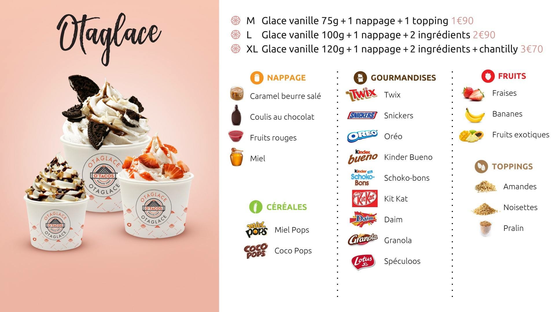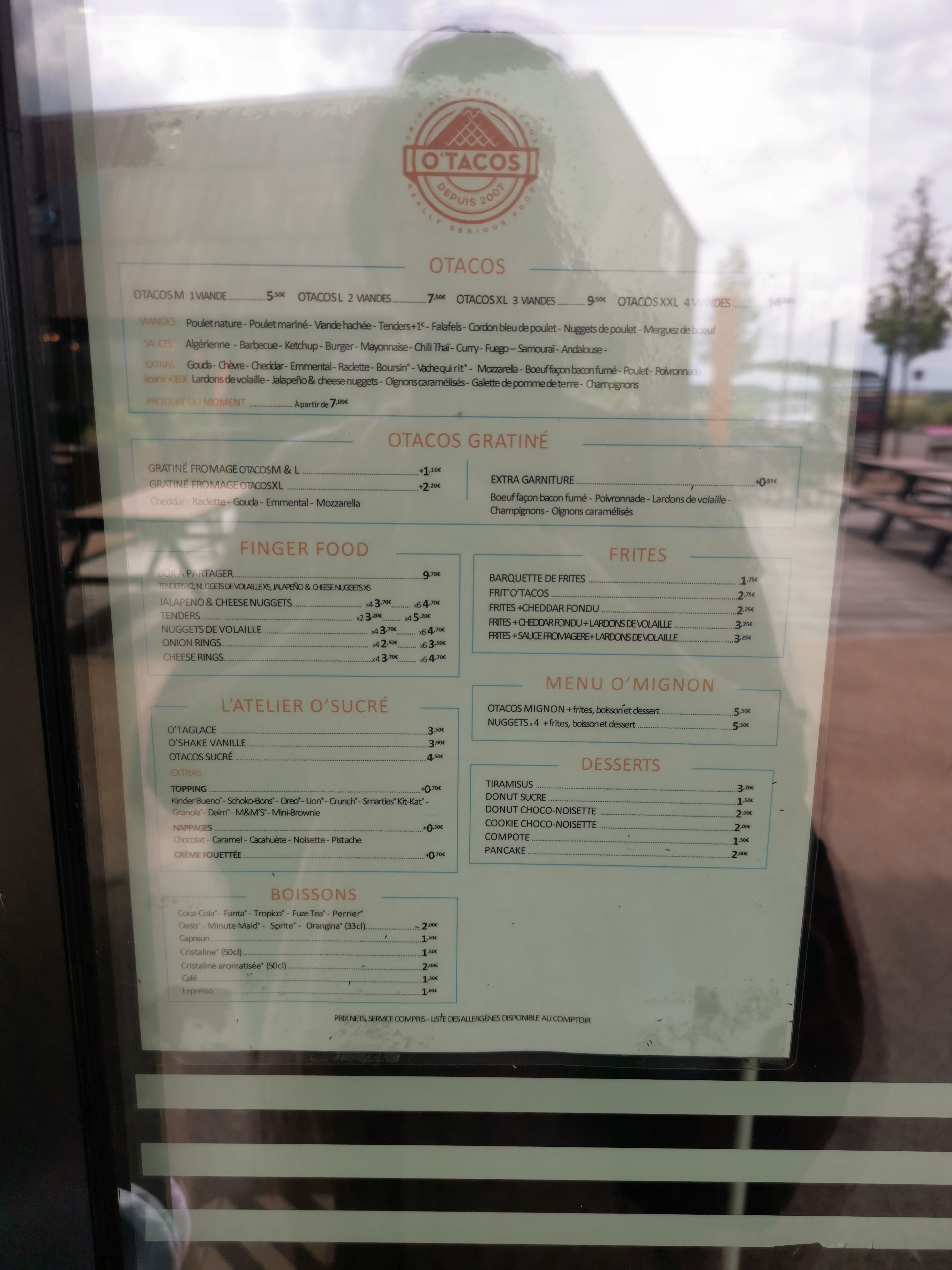 Posté le 07/08/2018 à 19:04"J’ai choisi un O’Tacos M - Viande Hachée - Sauce Algérienne - Fritotacos - O’Taglace Oreo/Kit Kat/Kinder Bueno La serveuse a oublié de me servir mes frites mais ce n’est pas très grave puisqu’elle s’en est rendue compte. Le service s’est fait en 5 minutes environ. C’était délicieux que ce soit le O’Tacos, le O’Taglace ou les Fritotacos. J’ai été pleinement satisfait pour une première visite, et j’y reviendrai de nombreuses fois ! Par contre je n’ai pas eu de porte-clés comme promis :( #UnTacosOuiMaisOTacos"